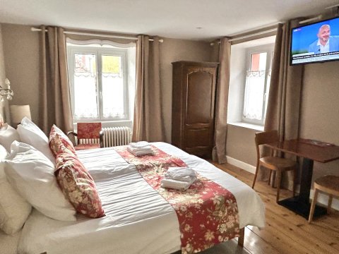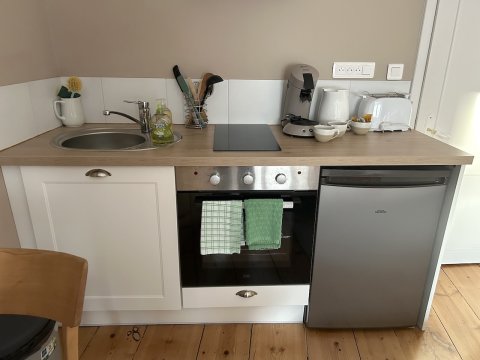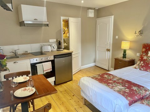 Le plancher en bois été poncé et vitrifié, les murs repeints, et une kitchenette équipée a été installée pour les repas pris sur place. Les hôtes peuvent aussi se rendre au restaurant de l’Hostellerie tout proche pour le déjeuner ou le dîner. La salle de bain a été entièrement refaite avec une grande douche, un lavabo rétro et des toilettes ainsi qu’un joli papier peint.