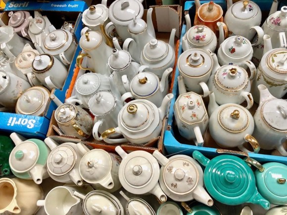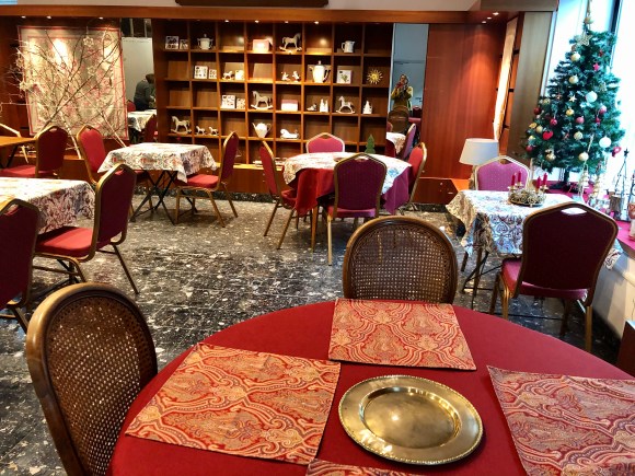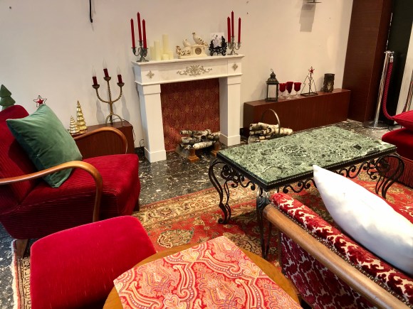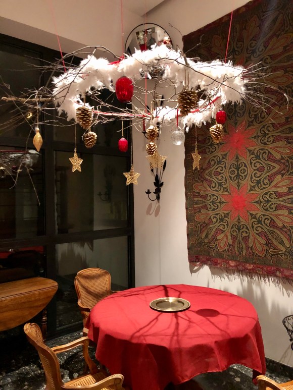 Le challenge : créer une ambiance cosy dans une pièce carrée de 100 m2 à très hauts plafonds, sur le thème de l’Alsace cossue et chaleureuse. D’où le choix des couleurs (grenat et vieil or), la couture de 14 nappes du tissu de Noël de la Ville de Mulhouse créé par Marie-Jo Gebel, la création de décors pour habiller les plafonds, murs et placards, la mise en place d’un coin salon, entre bois de bouleau, plumes blanches et trouvailles chinées… Car, comme dans chacun de nos gîtes, la majeure partie du mobilier, des décors ainsi que la vaisselle sont réunis au gré des brocantes, marchés aux puces ou vide-greniers ! Ainsi, nous possédons une splendide collection de services de thé vintage mis à disposition pour l’occasion. Nous avons aussi réparti dans toute la pièce des objets décoratifs vendus par le MISE. Une grand merci à l’Auberge du Zoo, qui nous a prêté les chaises (grenat et doré) parfaitement adaptées au thème décoratif !