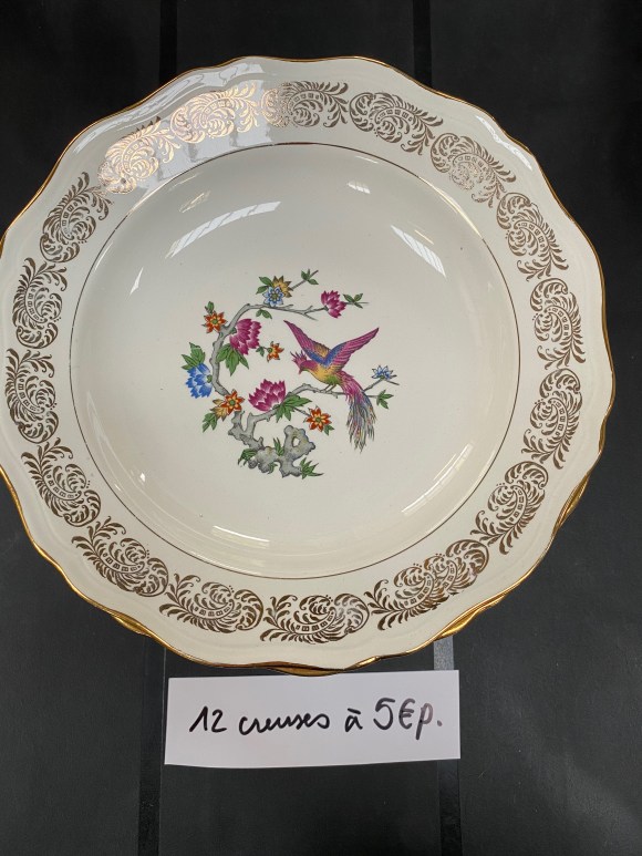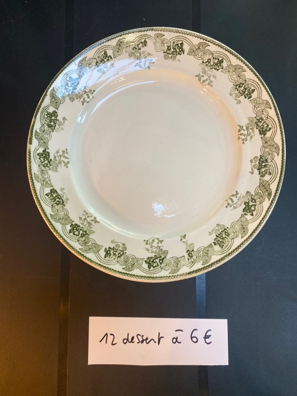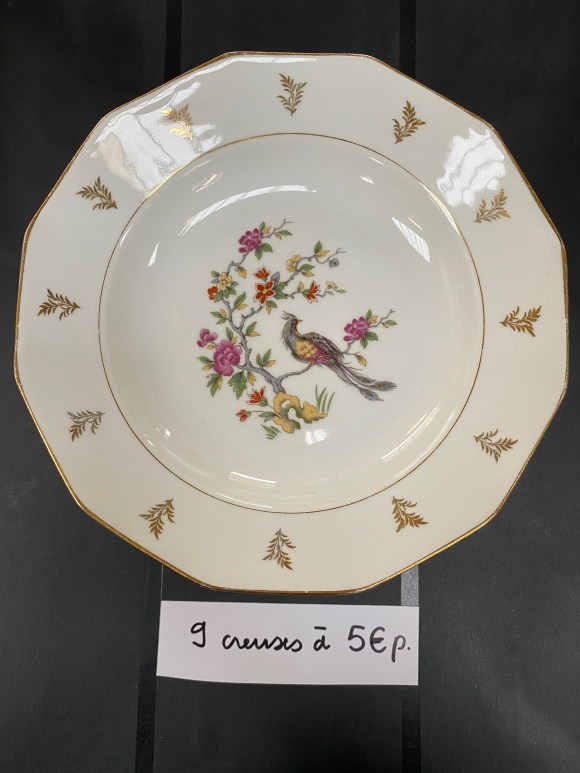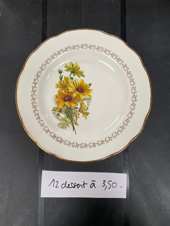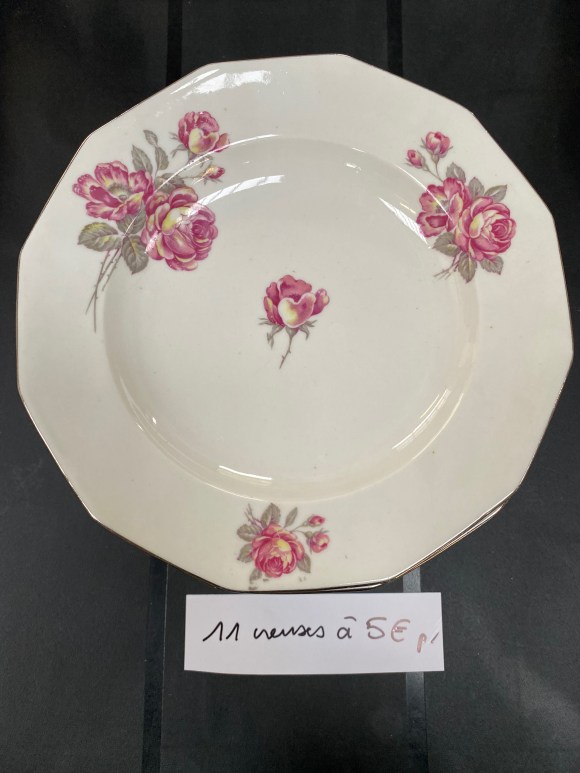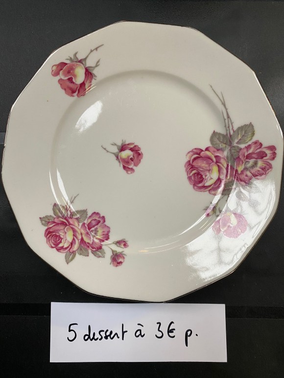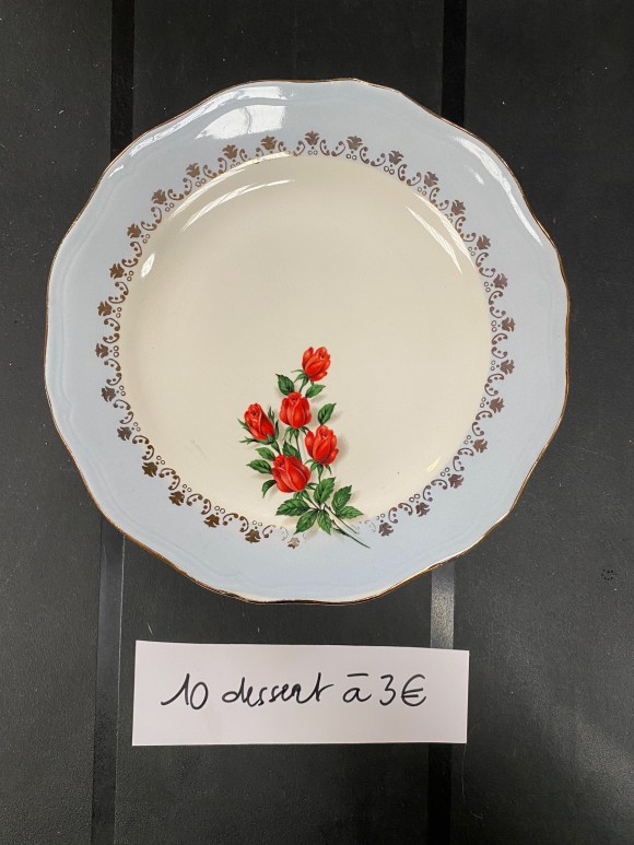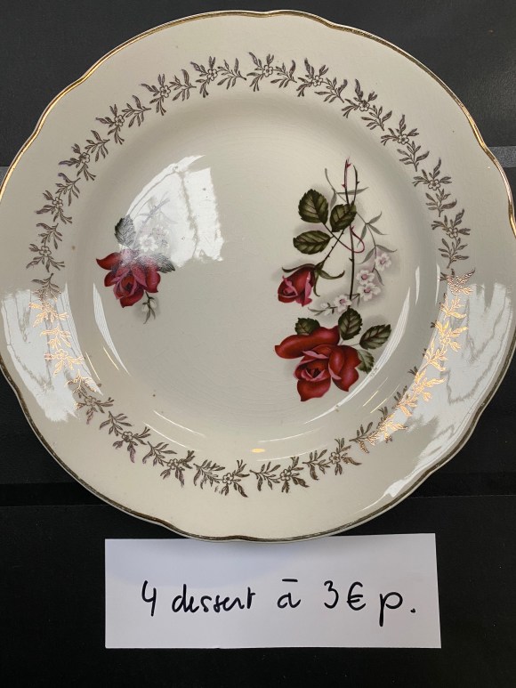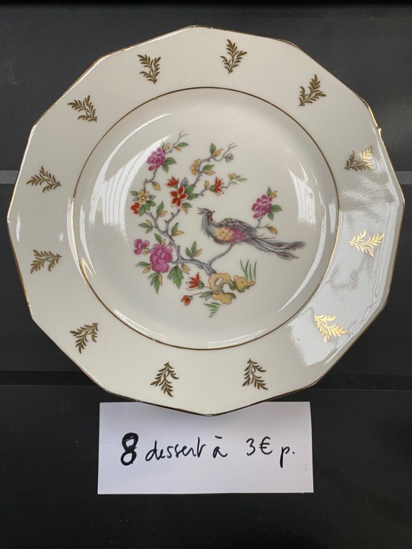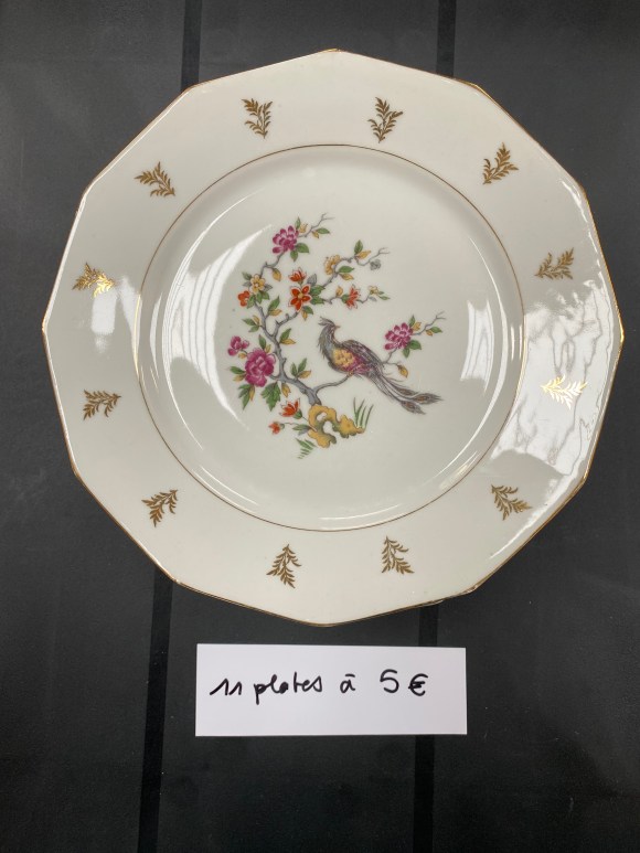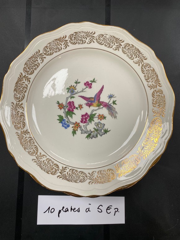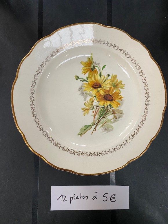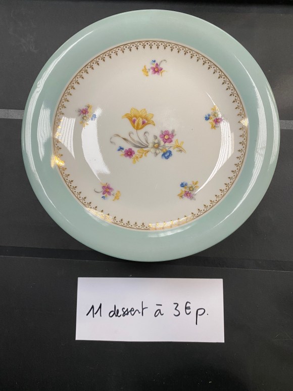 Argenterie, vaisselle, nappes, verres, tables…. ici il y a de quoi changer le décor du quotidien à peu de frais, en service de table complet ou dépareillé. Voici une galerie de photos d’une sélection d’assiettes vintage actuellement en stock, majoritairement en porcelaine des années 1940 à 1965. Attention, le stock bouge vite, que ce soit les services de table en faïence ou en porcelaine.