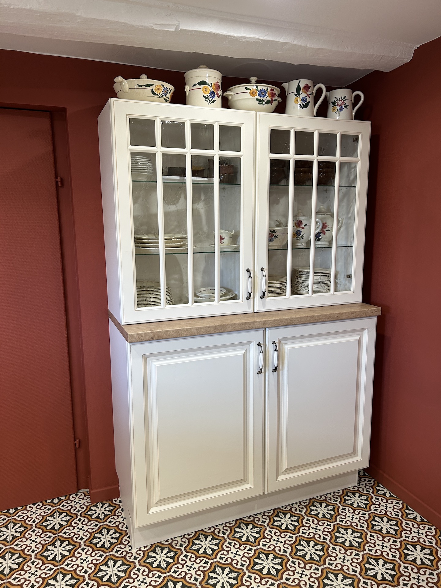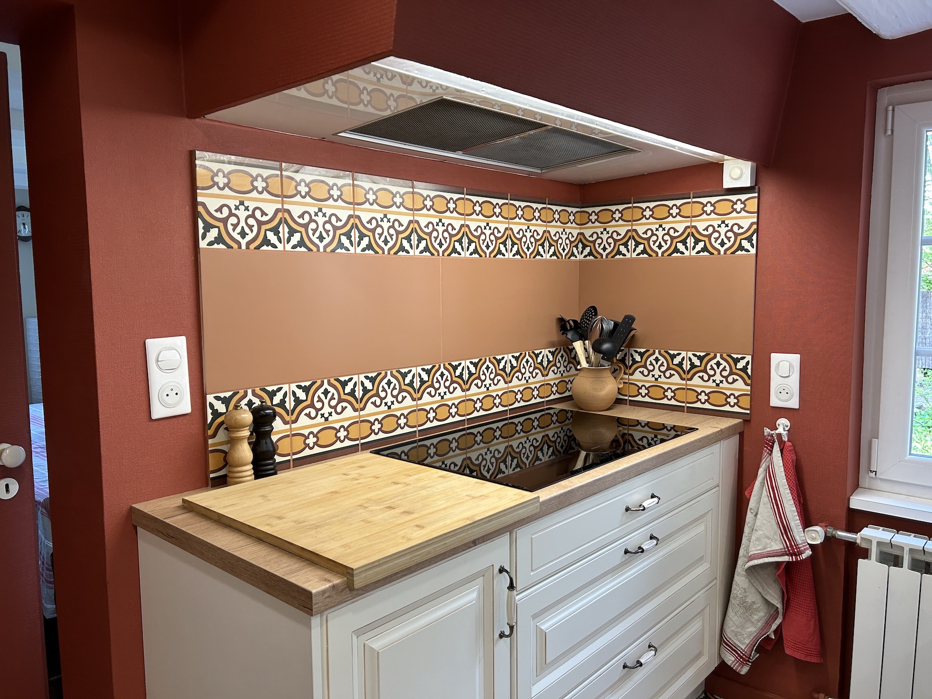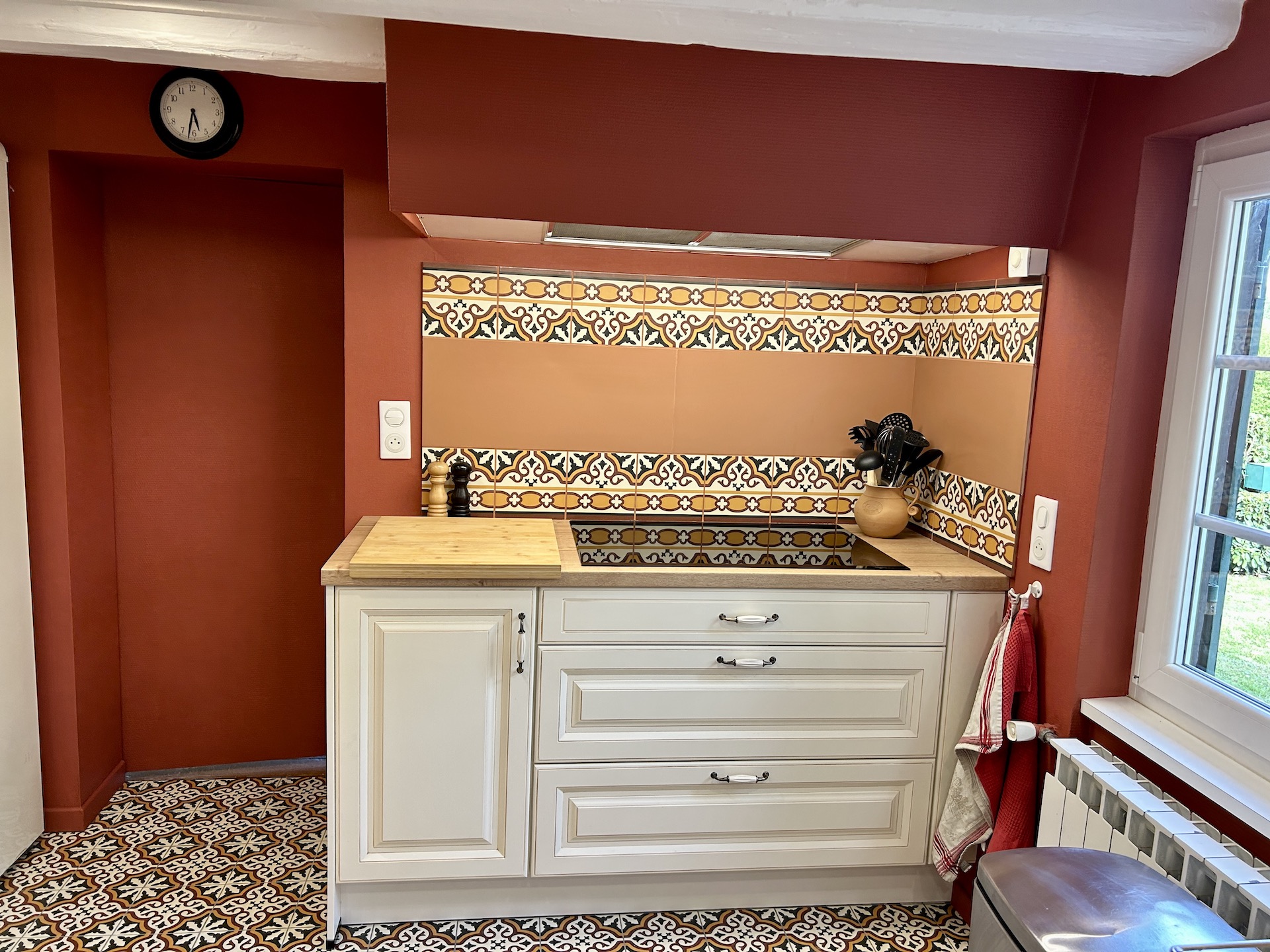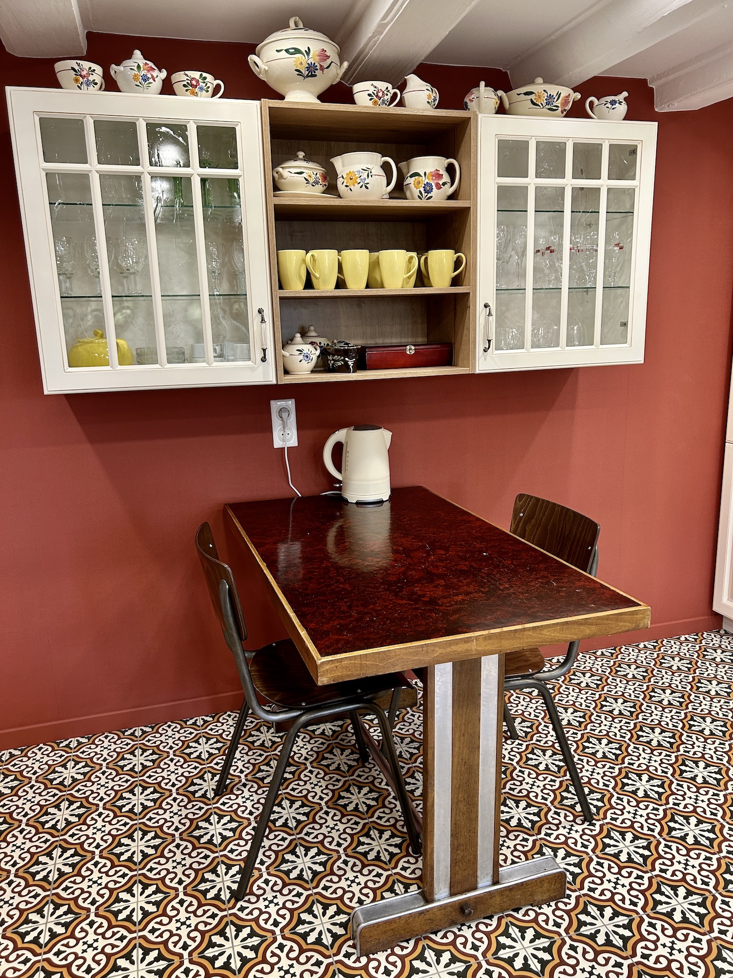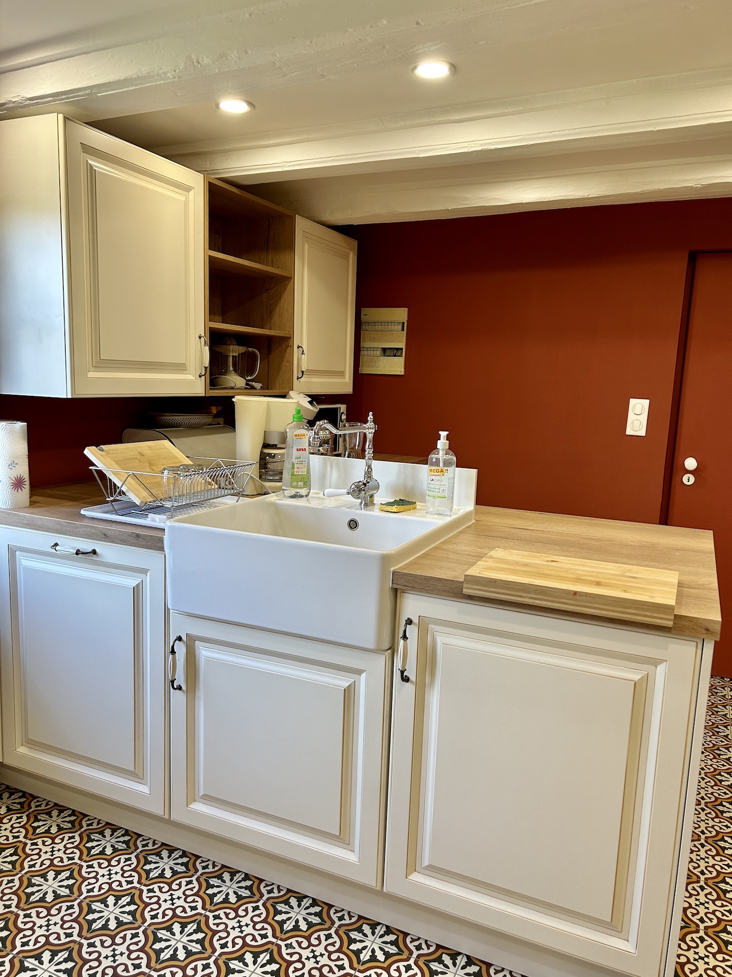 Dans un gîte, la cuisine doit être aussi pratique qu’à la maison. Et son esthétique en harmonie avec le décor général. Mortzi est maison alsacienne traditionnelle, avec ses colombages, ses poutres au plafond, son sol au carrelage ancien et ses murs en torchis. Nous avons donc recherché un style de cuisine qui corresponde à l’esprit campagnard et traditionnel de la maison, tout en étant très pratique au quotidien.