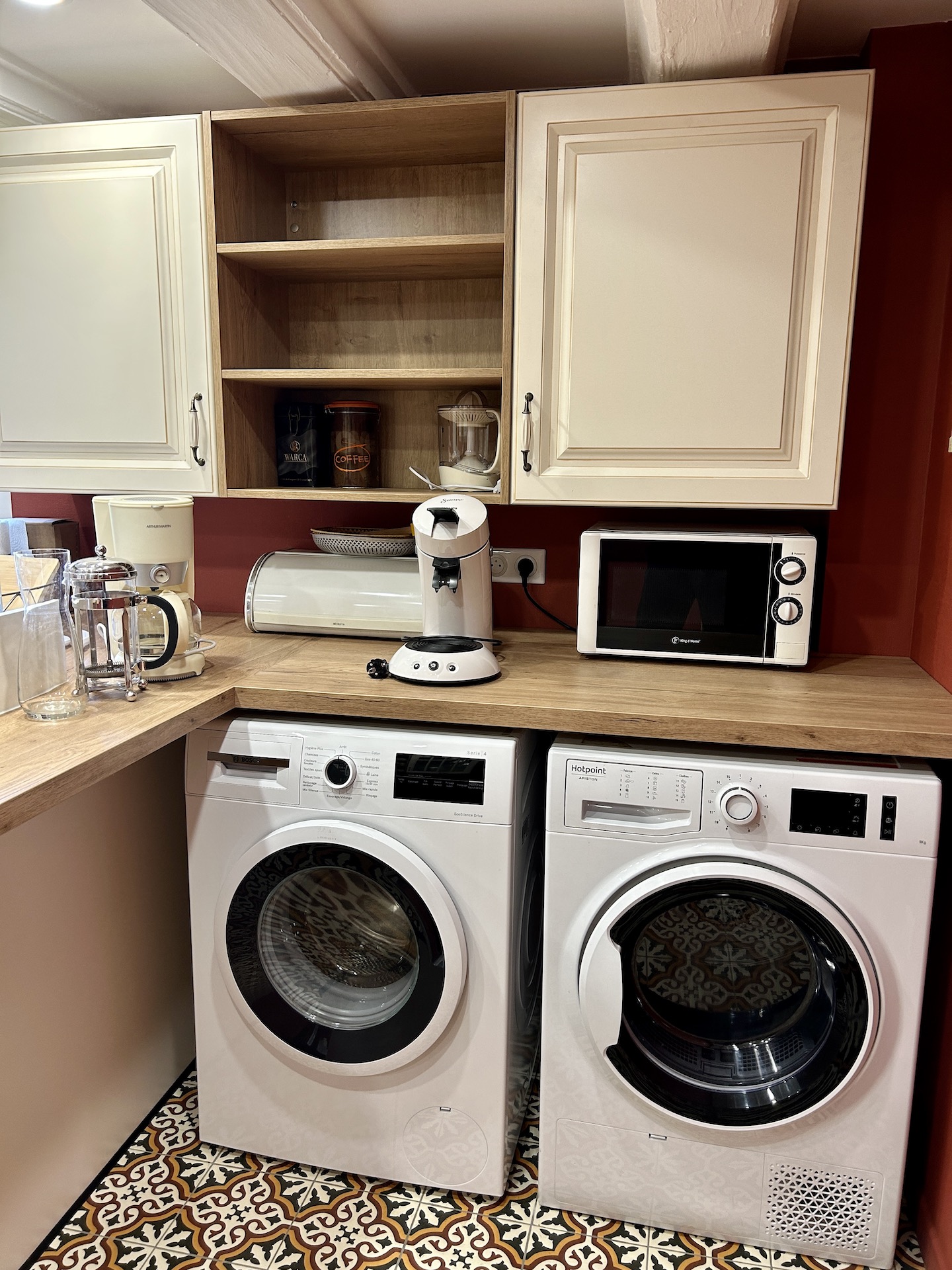 Bien que Mortzi possède deux salles à manger à l’intérieur (la Stuwa et la grande salle à manger) , nous avons disposé une table bistrot pour deux dans la cuisine, pour les cafés du matin ou les préparations culinaires. Nous avons profité de l’installation de la nouvelle cuisine pour refaire les sols, repeindre les murs et refaire l’électricité. Pour plus de confort, lave-linge et sèche-linge ont été installés à l’entrée de la cuisine pour les lessives des occupants. Le linge peut être suspendu dehors ou séché à l’intérieur.