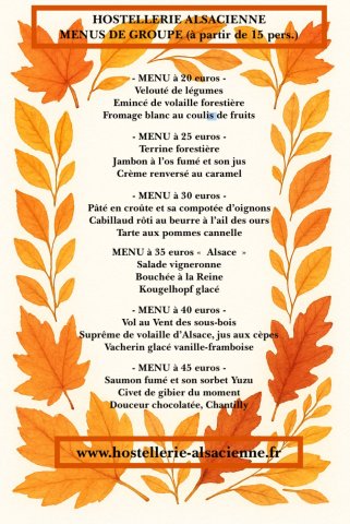 Les groupes à partir de 15 personnes sont les bienvenus à l’Hostellerie Alsacienne, pour des fêtes familiales, anniversaires ou réunions d’association ou d’entreprise. Selon le nombre de convives, l’Hostellerie met à disposition sa grande salle ou la Salle Emile Jung climatisée. Notre chef Loïc Pichereau adapte le menu selon les souhaits et le budget des clients. Un cocktail peut être proposé sur commande, pour 20 à 100 personnes. Le « Menu des Copains », formule tout compris avec tartes flambées à volonté, est très apprécié.